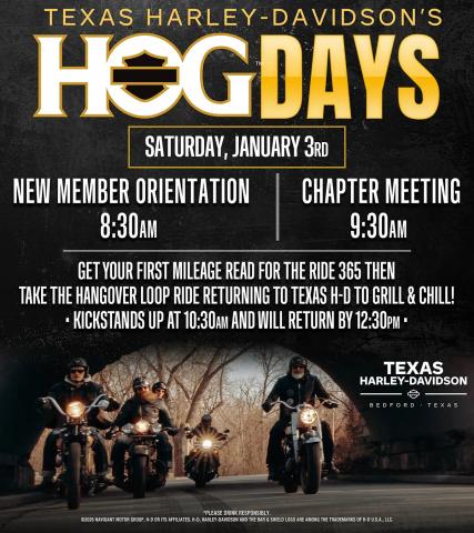 I know, what we do sounds fun, and you can't wait to join us and hang out. Do you own a Harley-Davidson? If not, just buy a new or used bike at Texas Harley-Davidson, and they will pay your membership dues for the first year!