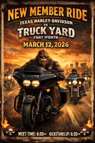 Join us for a high-energy chapter ride starting at Texas Harley-Davidson in Bedford and cruising over to the iconic Truck Yard Fort Worth. This ride is all about welcoming our newest H.O.G. Chapter members, building connections, and doing what we love most — riding together.
