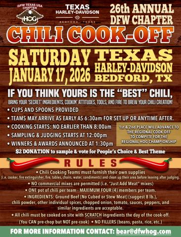 Photography Policy: Photographing, filming, recording and videotaping of activities and events will be occurring D/FW Texas USA Chapter events. By entering the H.O.G.® event area, you irrevocably grant permission to the Harley-Davidson Motor Company® and its agents to photograph, film, record and/or videotape you and use (and authorize the use of) your name, image, likeness, voice, and/or biographical or other information in any and all media now known or hereinafter developed in perpetuity for any and all purposes.